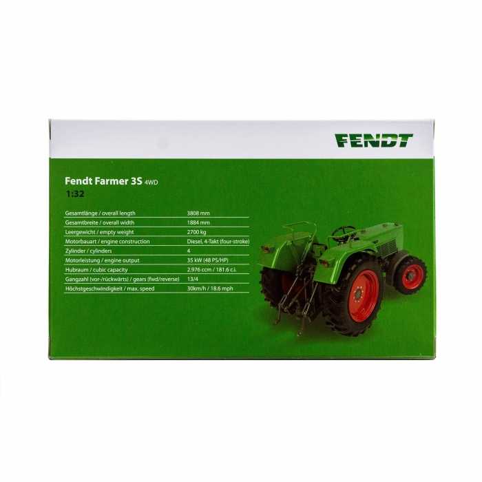 - This precision-built 1:32-scale Fendt Farmer 3S-4WD delivers accurate proportions and realistic details.