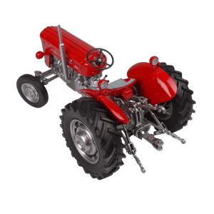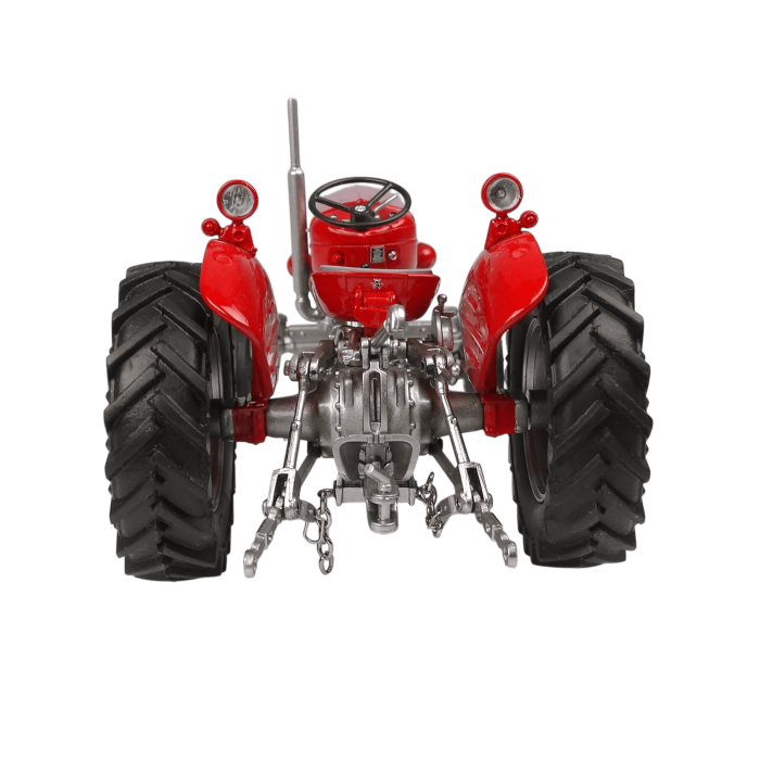 - Features realistic detailed engine components, aspecific European front grille, MF logo tampoprinted, a rubber cushion seat with red piping, a steering wheel, rear adjustable third-point linkage and movable linkage, and deep-tread rear rubber tires with an engraved pattern for a true-to-life finish.